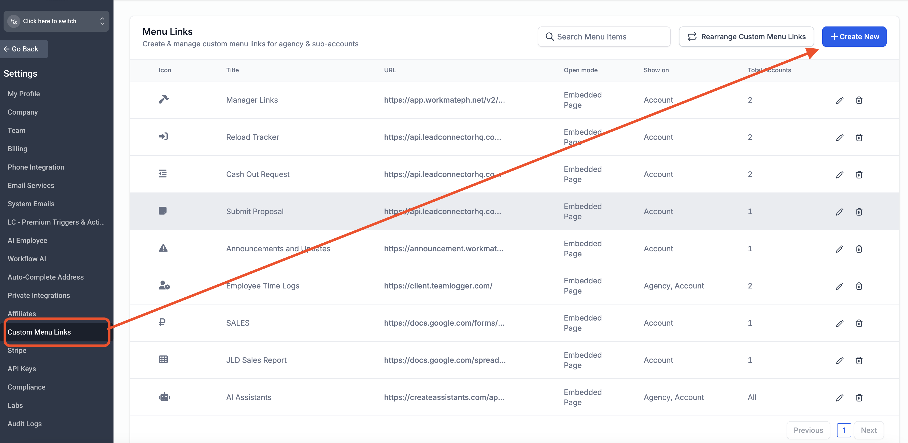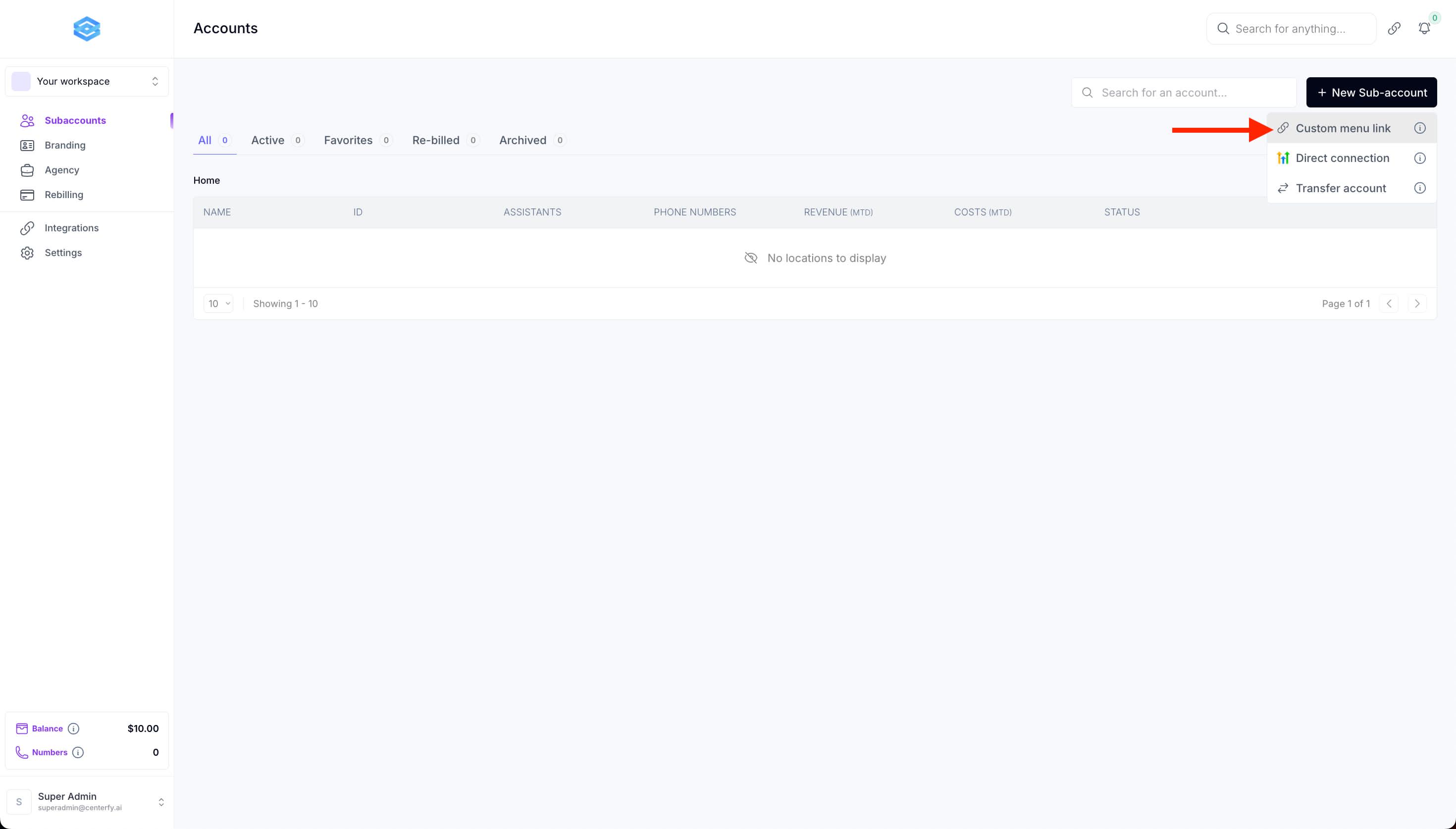 Step 2: Go to Subaccounts then click on "+New Sub-account" then Custom Menu Link.