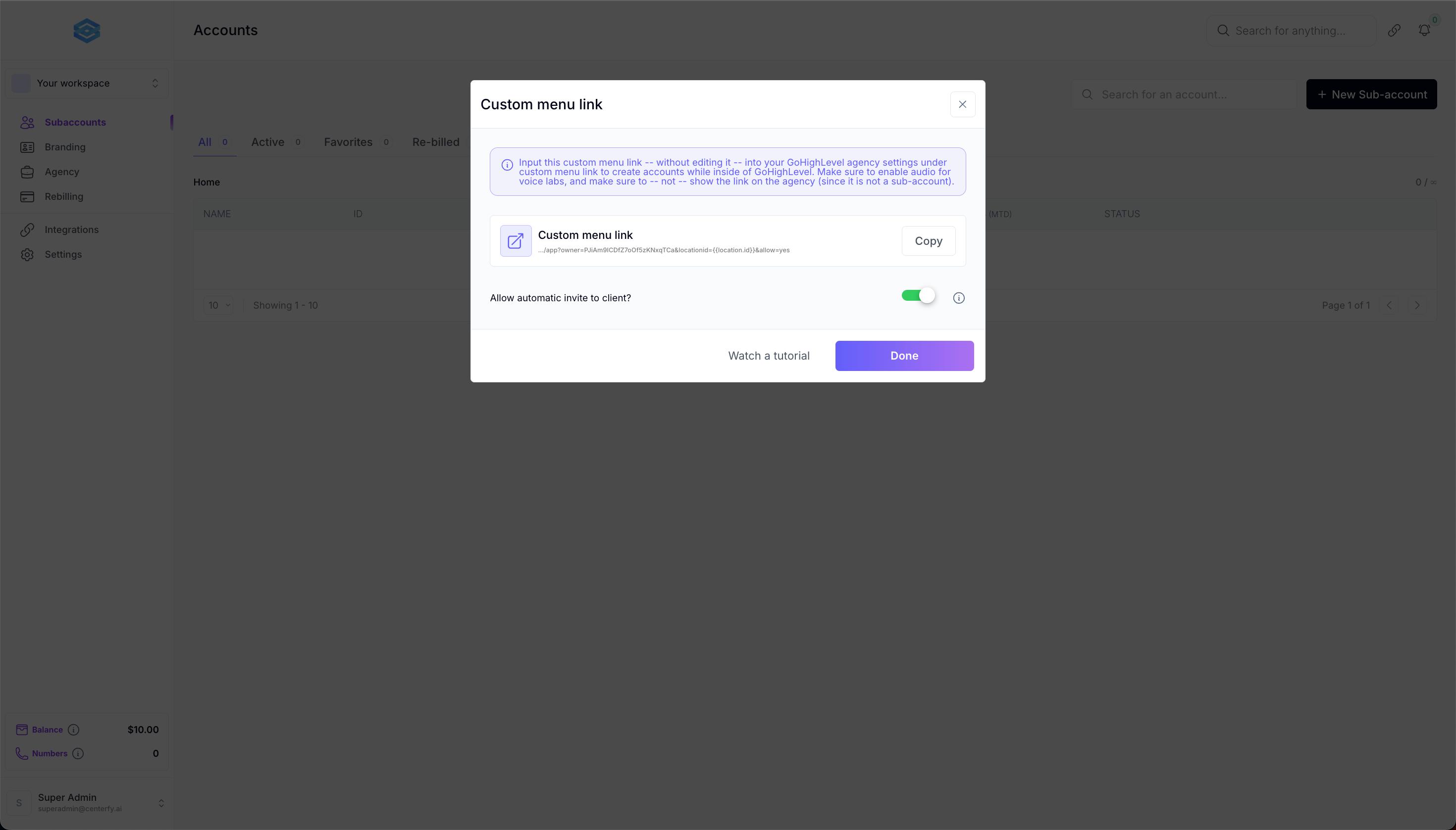 SCRIPT: This is your whitelabel workspace, make sure to bookmark this page as you will mainly use this page in setting up your branding, Account integrations and Rebilling.